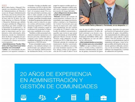 Manuel J. Fernández y Carlos Antón, socios de Alvegest y miembros del Colegio oficial de Administradores de Fincas de Murcia, responden a diversas cuestiones de actualidad en las Comunidades de Propietarios. Ver texto completo pulsando el siguiente enlace: Entrevista en el […]