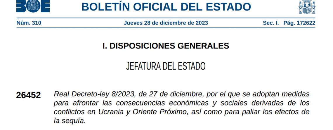 El Real Decreto-ley 8/2023, de 27 de diciembre, estableció medidas para afrontar las consecuencias económicas y sociales derivadas de los conflictos de Ucrania y Oriente Próximo, así como para paliar los efectos de la sequía (BOE nº 310, de 28 de diciembre).